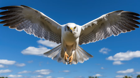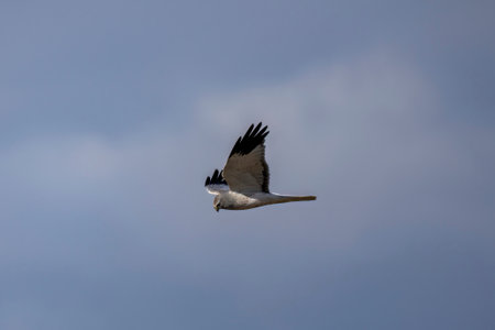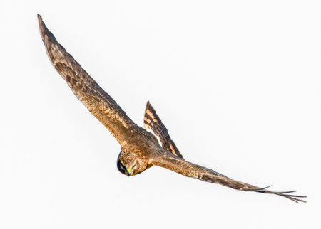 Stunning isolated image of a Harrier bird soaring through the sky, showcasing exquisite details of its feathers and form. Perfect for nature enthusiasts and wildlife photography.