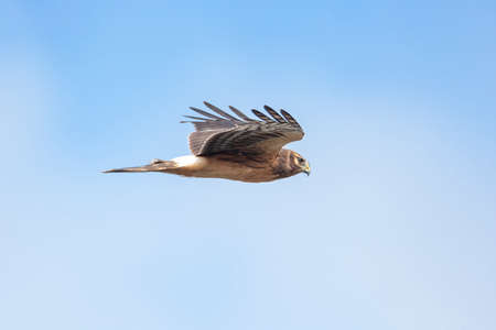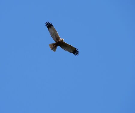 A Western Marsh Harrier flying on a sunny day in springtime, blue sky