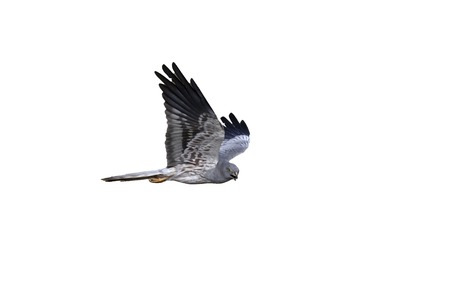 male northern harrier - Circus hudsonius - marsh hawk, grey or gray ghost. great feather detail, yellow eye, tail bands, orange talons Isolated on white background