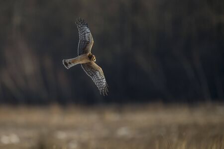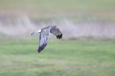 Flying juvenile Montagus harrier (Circus pygargus) over the meadow. Kaluga region, Russia