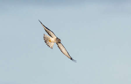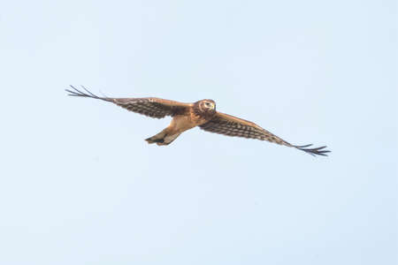 A Northern Harrier soars in the sky of the plains near Clinton, Oklahoma,