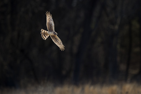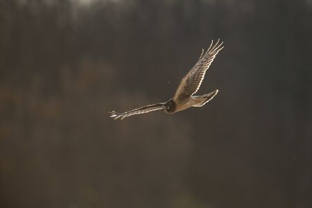 A Northern Harrier flies in front of a dark background as it glows in the setting sunlight flying over an open field.
