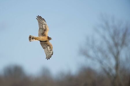 A Northern Harrier flies over an open field with a tree background in the winter on a bright sunny day.