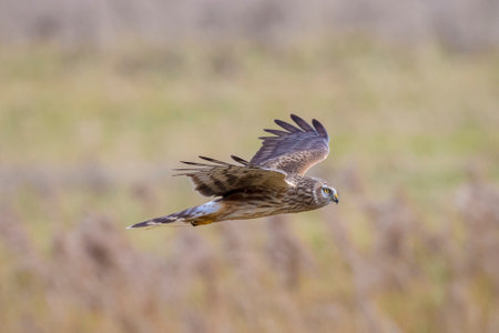 Female Hen harrier, Circus cyaneus, or northern harrier hunting above a meadow during a cold winter