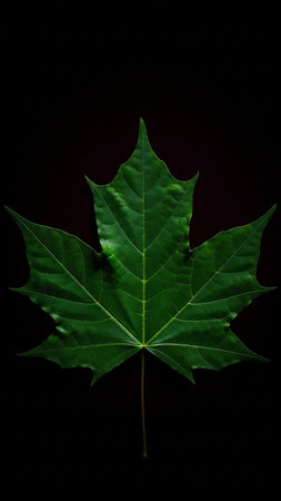 A single, vibrant green maple leaf with detailed veins and serrated edges is dramatically lit against a deep black background, emphasizing its natural form and texture.