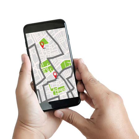 Traveler hands use map on mobile phone app to search for route location of place with gps on street when travel in city