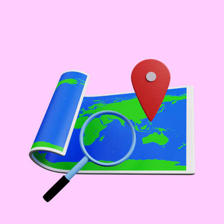 A magnifying glass with pins pinned on the map. pushpin showing the location of a destination point on a map. Travel plan concept.