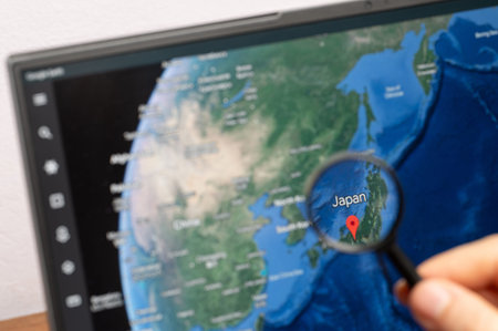 New York, USA - July 11, 2023: Zooming on Japan country through magnifying glass on screen of google earth close up view