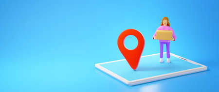 3D render of woman take parcel box. Business online mobile and e-commerce on web shopping concept. Secure online payment transaction with smartphone.