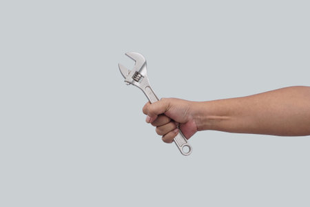 a man hand holding a spanner isolate on white background