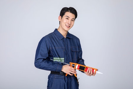 millennials and gen z, korean asian young man, site staff with caulking gun