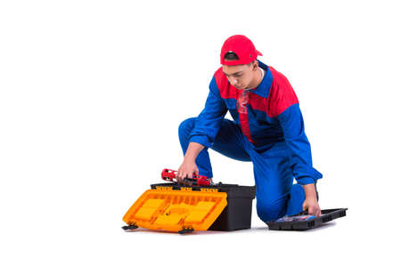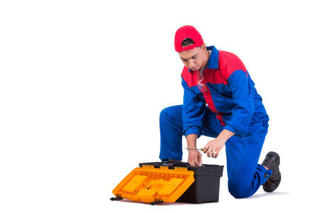 Young repairman with wrench spanner isolated on white