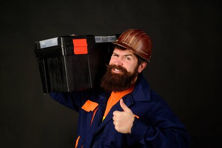 Tools for repair. Builder man carrying tool box giving thumbs up. Repairman in overall hold toolbox. Man with tool box. Builder in protective helmet with toolbox. Repair. Handyman concept. Repair kit
