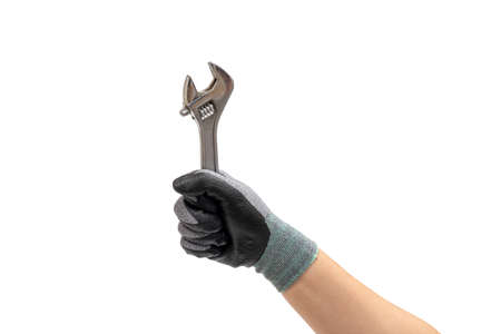 Worker's caucasian male hand in a dirty rubber glove holding a wrench spanner tool, composition isolated over the white background