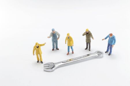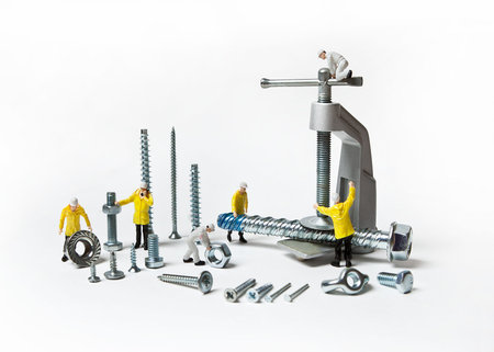 tiny toy workers tightening a nut of a bolt