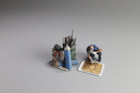 Damaged sim card and miniature figure model scene.