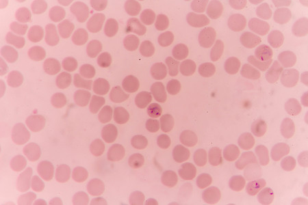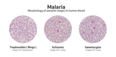 Microscopic examination of blood films from malaria infected patients showing the morphology of malaria parasite stages in human red blood cells. Trophozoites (rings), Schizonts, and Gametocytes.