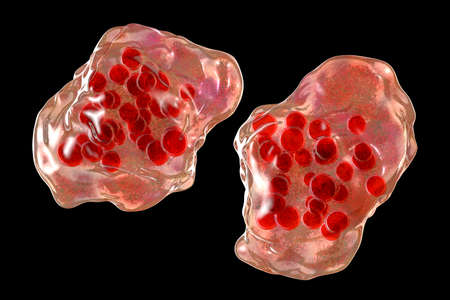 The malaria-infected red blood cells. 3D illustration showing malaria parasite Plasmodium falciparum in schizont stage inside red blood cells, the causative agent of tropical malaria