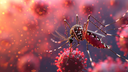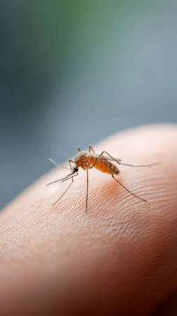 Mosquito standing on human skin and sucking blood, potentially spreading diseases like malaria, dengue fever, and zika virus, highlighting the importance of mosquito control and prevention