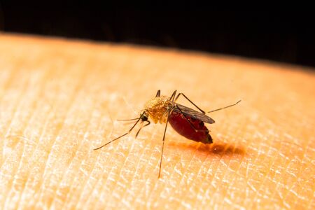 Mosquito with a syringe injection mouth drawing blood from a human skin.