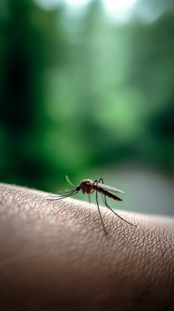 Mosquito hovering near exposed skin, threatening transmission of dangerous diseases including malaria, dengue, and zika virus while causing potential health complications