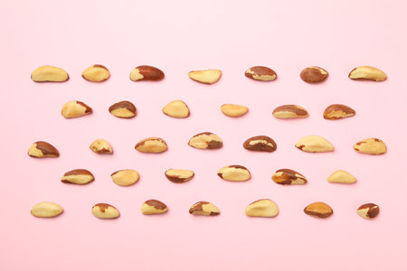 Flat lay with tasty brazil nuts on pink background