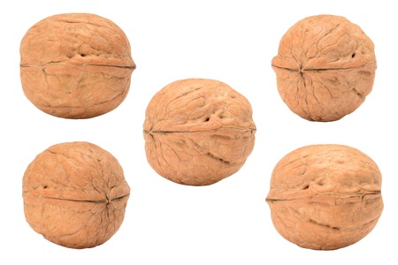 Set of whole walnut, view from five different sides. Isolated on white background.