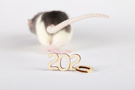 Happy New Year! figures 2020, the rat (mouse) gnawed a wooden figure (number) zero and leaves.In the photo is just the tail