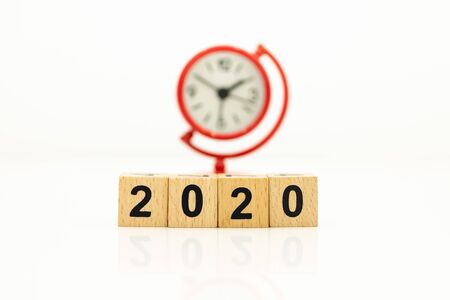 2020 new year greeting card. 2020 wooden numbers on white table, isolated on white background. Copy space.