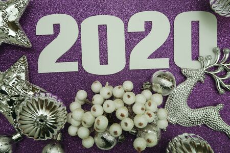2020 happy new year with red star berry and reindeer decoration on purple glitter background