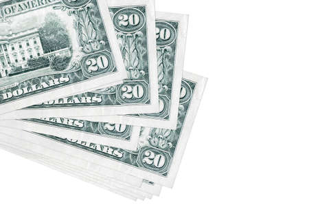 20 US dollars bills lies in small bunch or pack isolated on white. Mockup with copy space. Business and currency exchange concept