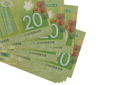 20 Canadian dollars bills lies isolated on white background with copy space. Rich life conceptual background. Big amount of national currency wealth