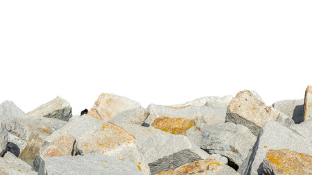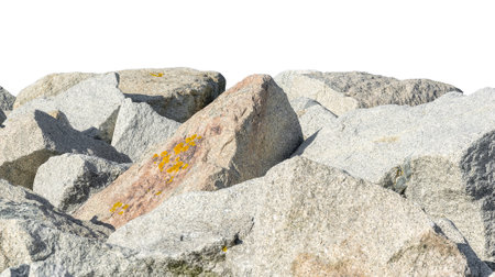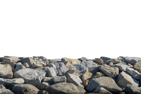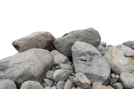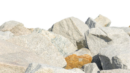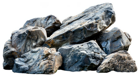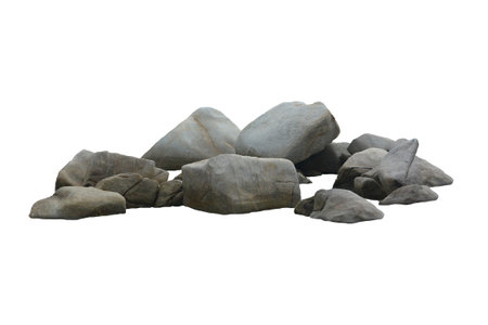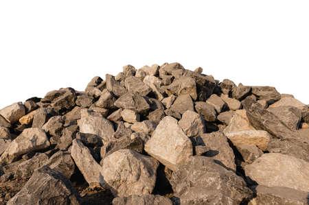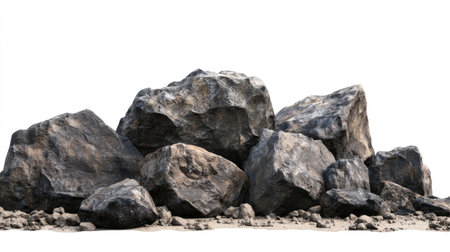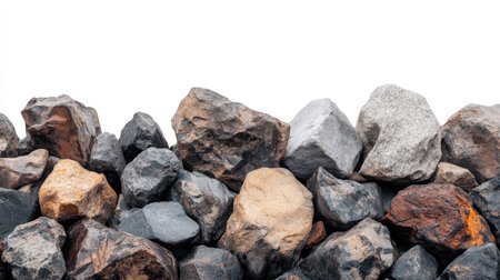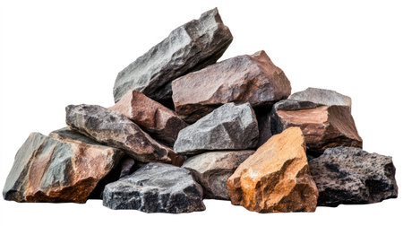 A natural pile of rocks isolated against a white background, showcasing varied textures and colors. Ideal for a range of creative projects.