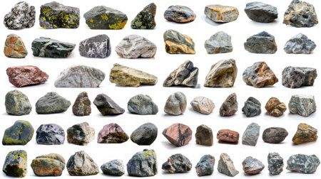 Different types of rocks arranged neatly, isolated on white background