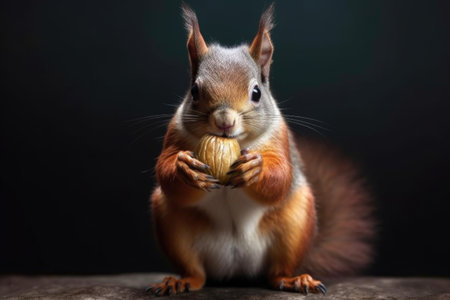 close-up of a squirrel holding a nut in its paws, created with generative ai