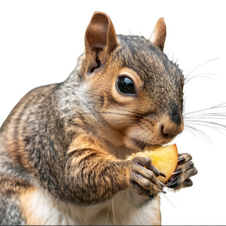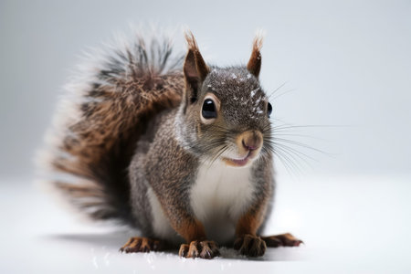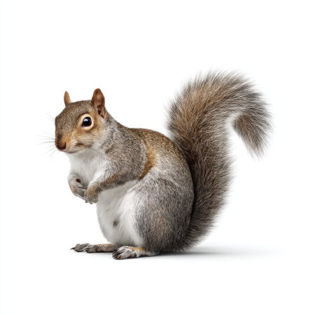 This close-up portrait captures a gray squirrel sitting confidently against a white background, showcasing its fluffy tail and expressive features in stunning detail.