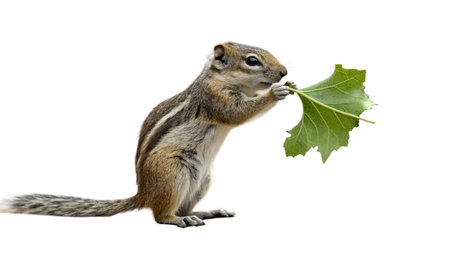 Chipmunk eating a green leaf isolated on white background with clipping path