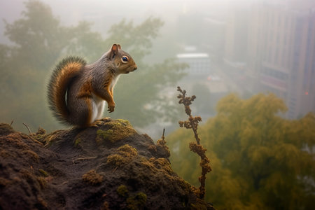 Squirrel sitting on tree trunk of a park with city in the background. Amazing wildlife. Generative Ai