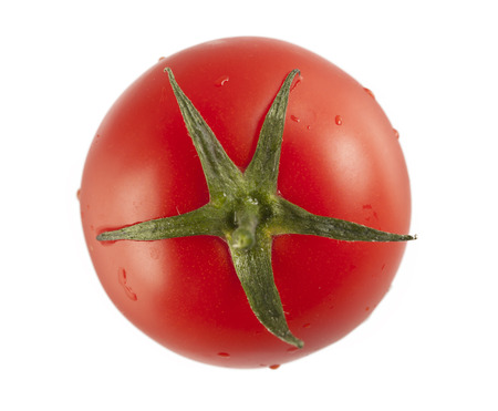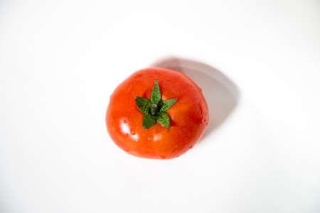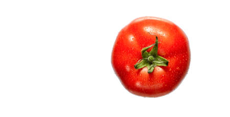 Top view of one ripe raw red juicy tomato with green stem and leaves and water drops isolated on white background used as ingredient of juice, salad, ketchup, salsa and other food