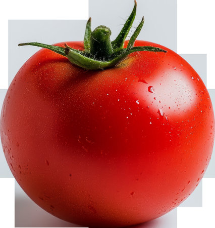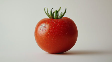 A fresh, ripe tomato covered in water droplets, placed against a neutral background, highlighting its vibrant color and natural texture.