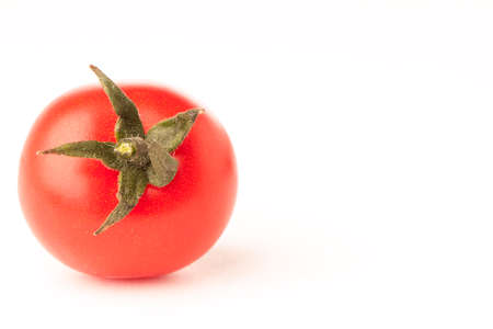 A single cherry tomato, isolated on a white background, emphasizing a juicy and fresh vegetable