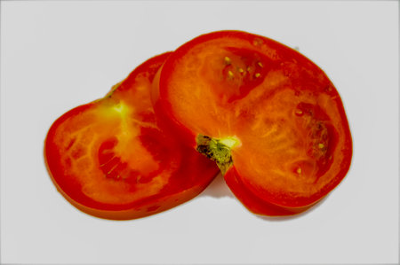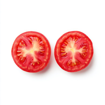 Two freshly cut red tomato halves showcase their vibrant color and juicy texture on a clean white background, perfect for culinary uses and healthy recipes.