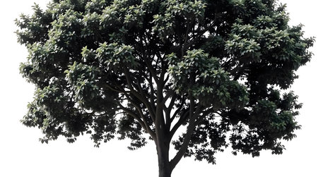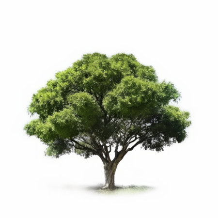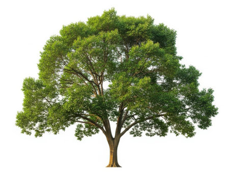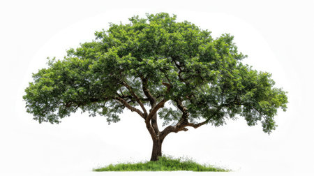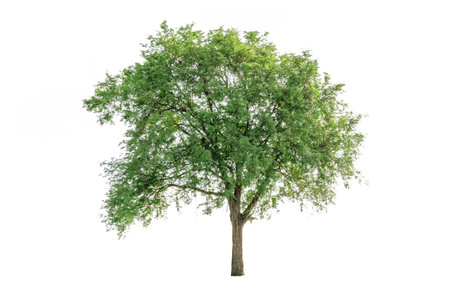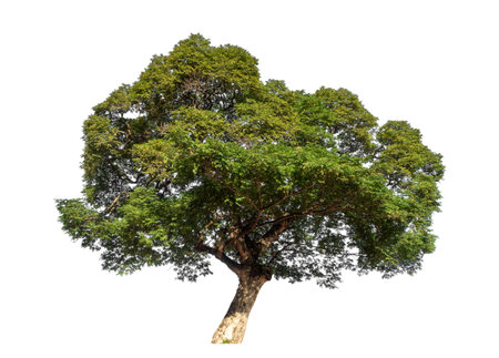 Imposing Chamchuri tree with a robust trunk and intricate, beautifully branched leaves, highlighted on a white background