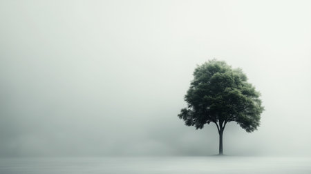 A solitary tree stands amidst swirling mist, evoking tranquility in the early morning light.