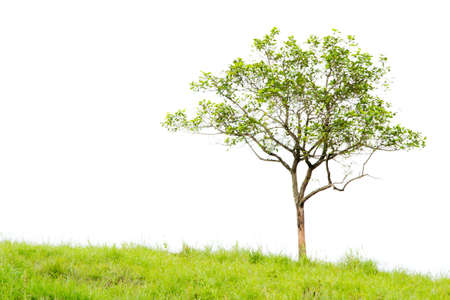 Single lonely tree with green grass isolated on white background