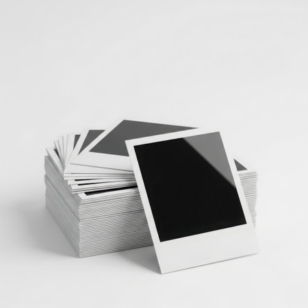 A pile of unexposed instant photographs is presented against a plain background, with one photo tilted forward.