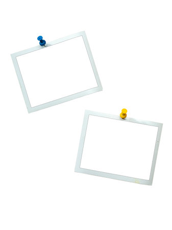 Instant frames hang on wall with colored pins. Isolated on White with clipping path