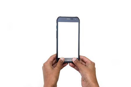 Mobile phone mockup, white screen with man hand holding smartphone and using touching screen take a photo isolated on white background, copy space with clipping path.