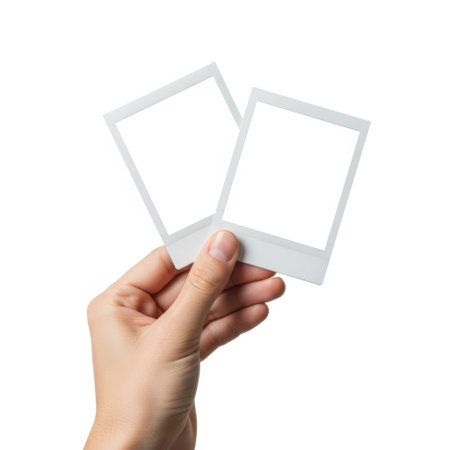 Hand holding polaroid frames, isolated on white background
