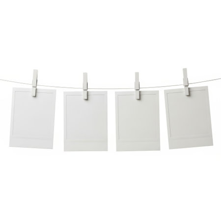 Two blank photographs hanging on clothespins, isolated on white background